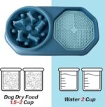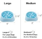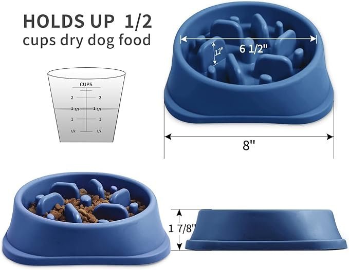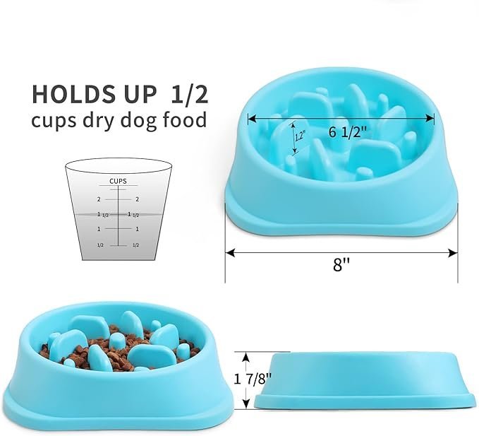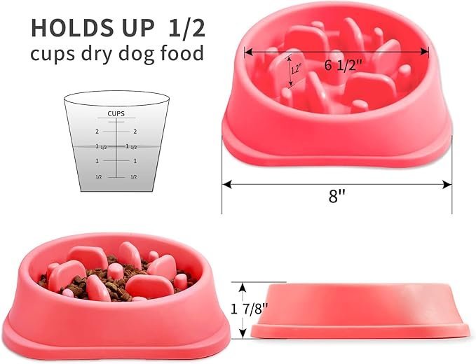 • โœ”ใ€Reasonable food intakeใ€‘: Pet Slow Feeder Bowl Diameter: 6 1/2 inches. Bottom Diameter: 8 inches. Height: 1 7/8 inches. It can hold 1 1/2 cups of food. Suitable for small/medium sized dogs.